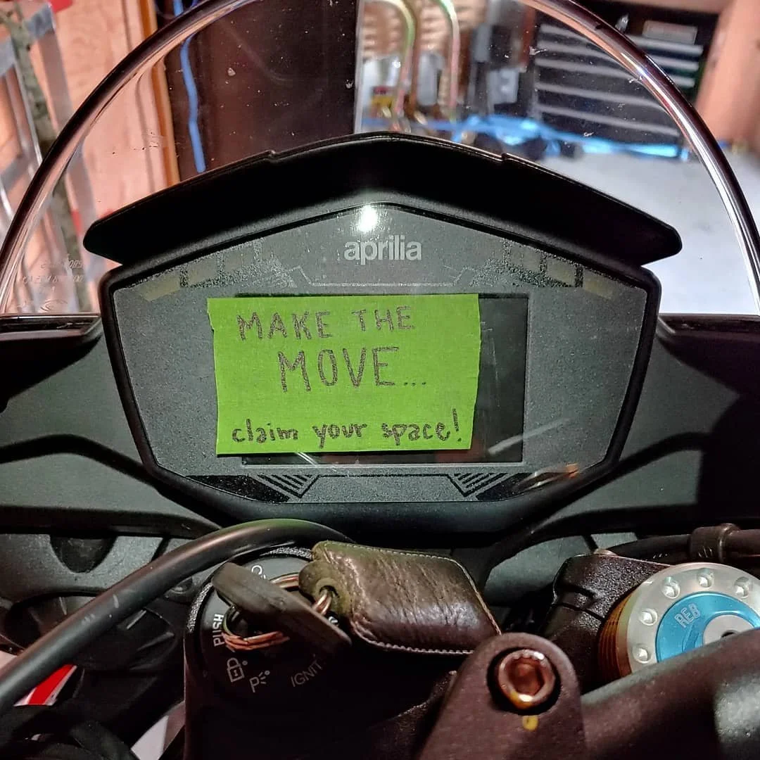 During a break I taped my dash to remind myself - I've come far enough I don't have to ride to let people pass me (my habit is still to position myself on track and adjust my speed down on the straits to be easily and predictably passed since I've been so slow for so long).